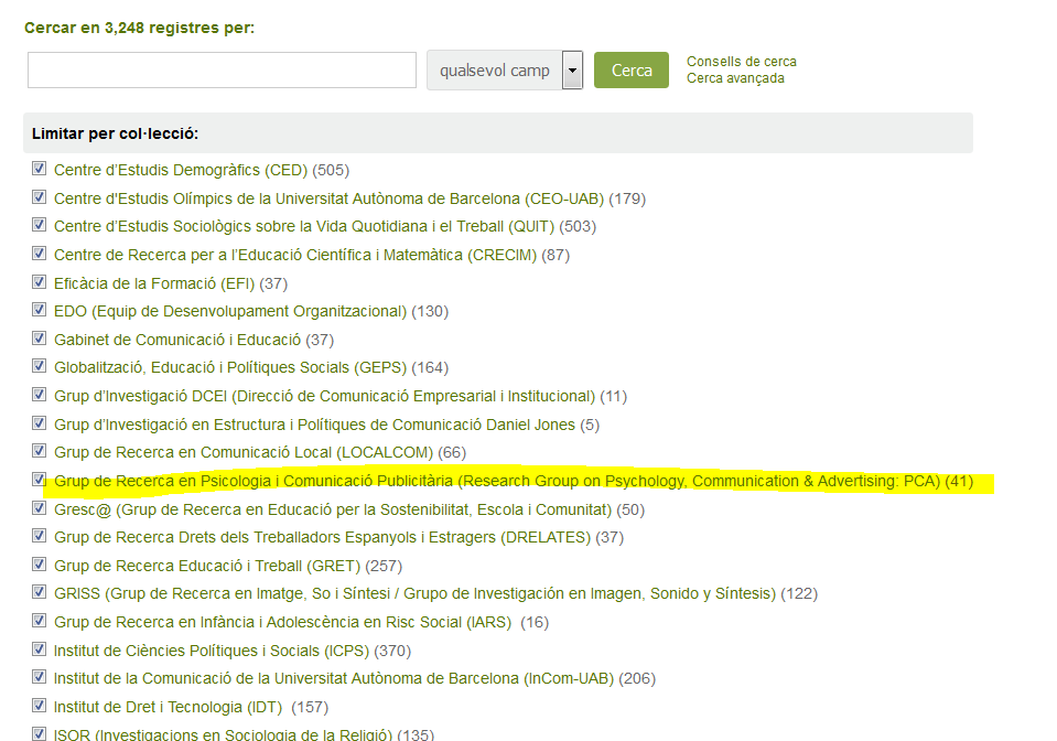 Aquest grup de recerca ha de penjar de la col·lecció "Ciències socials i jurídiques" i el $b de la 980 portarà PCAUAB