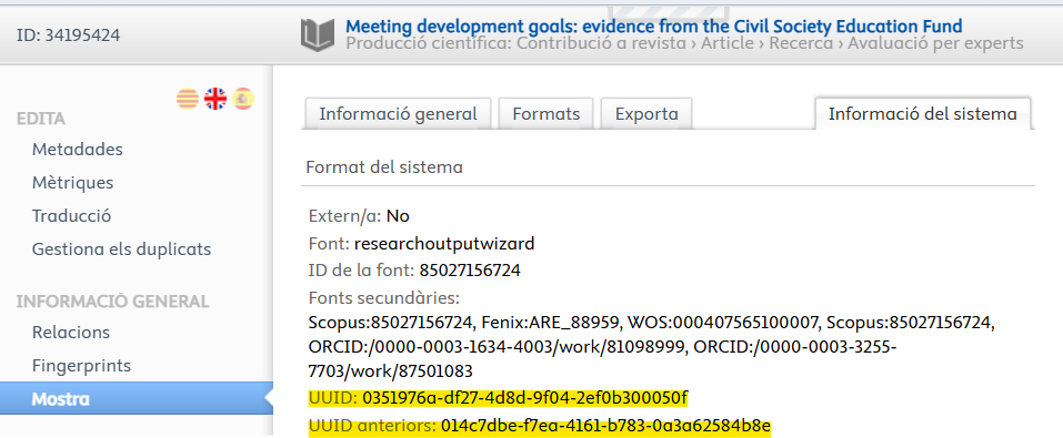 035 __ $a oai:egreta.uab.cat:publications/8f99a015-f8e6-4510-be19-4cc680633b2b. El UUID d'aquest registre a Egreta és 8f99a015-f8e6-4510-be19-4cc680633b2b. Si fem una cerca per ell a Egreta trobem el registre. El problema és que al fusionar 2 registres probablement no sabem quin UUID ha quedat com a principal. Això és important per poder esborrar al DDD l'altra 035. On trobem a Egreta el UUID d'un registre?